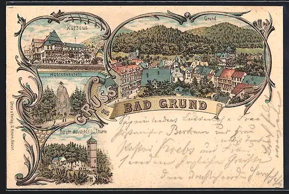 Lithographie Bad Grund, Kurhaus, Hübichenstein und Iberger Aussichtsturm