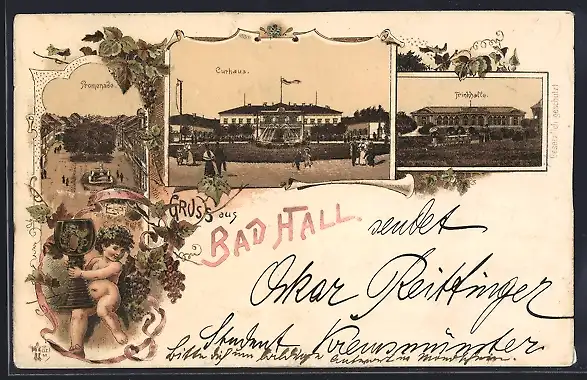 Lithographie Bad Hall, Curhaus, Promenade, Trinkhalle