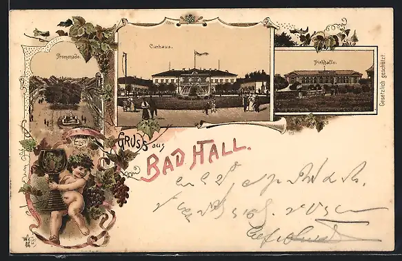 Lithographie Bad Hall, Curhaus, Trinkhalle, Promenade aus der Vogelschau