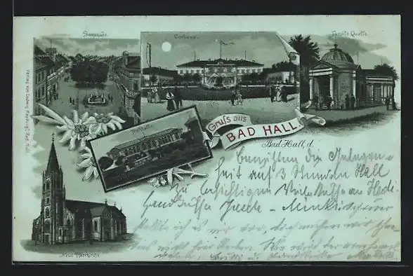 Lithographie Bad Hall, Kurhaus, Neue Pfarrkirche und Tassilo Quelle