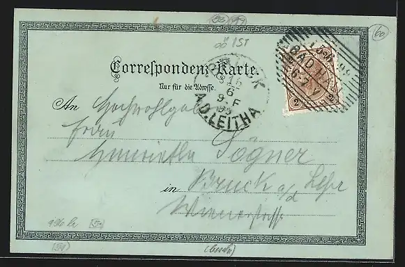 Personenbezogene Daten auf der Rückseite der Karte wurden durch blauen Textmarker unkenntlich gemacht. Die blauen Stellen sind auf die Vorderseite durchgeweicht und wirken sich negativ auf das Postkartenfoto aus