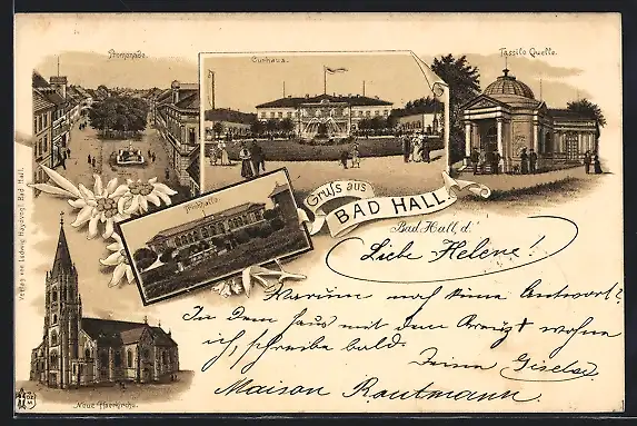 Lithographie Bad Hall, Trinkhalle, Promenade, Curhaus, Tassilo Quelle, Neue Pfarrkirche