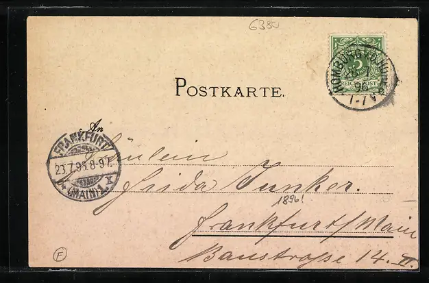 Personenbezogene Daten auf der Rückseite der Karte wurden durch blauen Textmarker unkenntlich gemacht. Die blauen Stellen sind auf die Vorderseite durchgeweicht und wirken sich negativ auf das Postkartenfoto aus