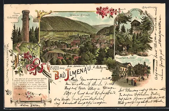 Lithographie Bad Ilmenau, Schwalbenstein, Wasserheil-Anstalt, Thurm auf dem Kickelhahn