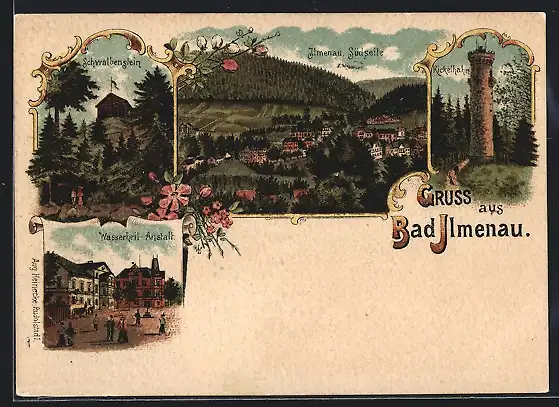 Lithographie Bad Ilmenau, Schwalbenstein, Wasserheilanstalt und Kickelhahn