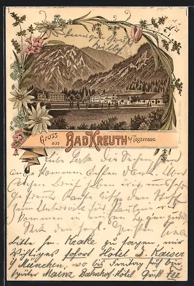 Lithographie Bad Kreuth b. Tegernsee, Panoramablick auf Ort und Gebirge