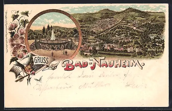 Lithographie Bad Nauheim, Gesamtansicht & Springbrunnen