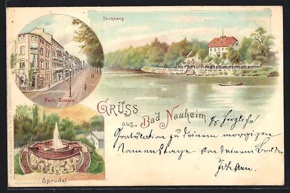 Lithographie Bad Nauheim, Parkstrasse mit Wohnhäusern, Teichhaus, Sprudel