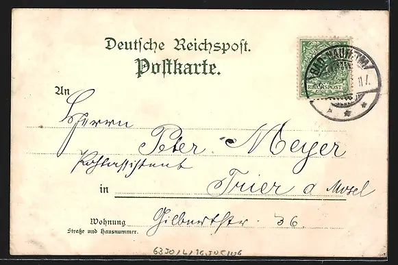 Personenbezogene Daten auf der Rückseite der Karte wurden durch blauen Textmarker unkenntlich gemacht. Die blauen Stellen sind auf die Vorderseite durchgeweicht und wirken sich negativ auf das Postkartenfoto aus
