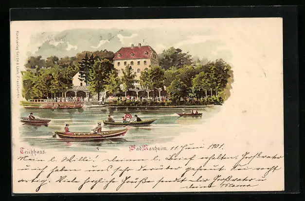 Lithographie Bad Nauheim, Teichhaus mit Ruderpartie
