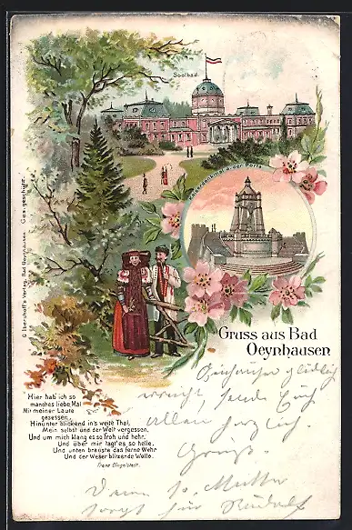 Lithographie Bad Oeynhausen, Kaiserdenkmal a. d. Porta, Soolbad