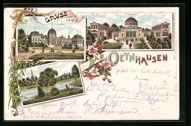 Lithographie Bad Oeynhausen, Thermalbad, Soolbad, Goldfischteich