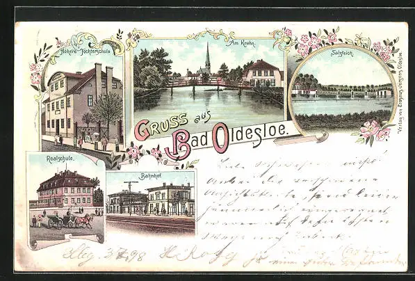 Lithographie Bad Oldesloe, Bahnhof, Salzteich, Höhere Töchterschule, Realschule