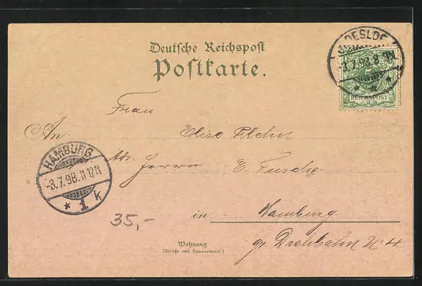 Personenbezogene Daten auf der Rückseite der Karte wurden durch blauen Textmarker unkenntlich gemacht. Die blauen Stellen sind auf die Vorderseite durchgeweicht und wirken sich negativ auf das Postkartenfoto aus