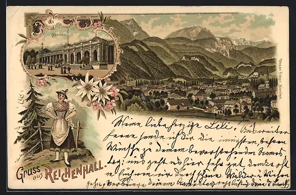 Lithographie Bad Reichenhall, Colonaden, Ortsansicht aus der Vogelschau, Frau in Tracht