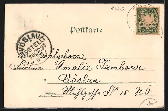 Personenbezogene Daten auf der Rückseite der Karte wurden durch blauen Textmarker unkenntlich gemacht. Die blauen Stellen sind auf die Vorderseite durchgeweicht und wirken sich negativ auf das Postkartenfoto aus
