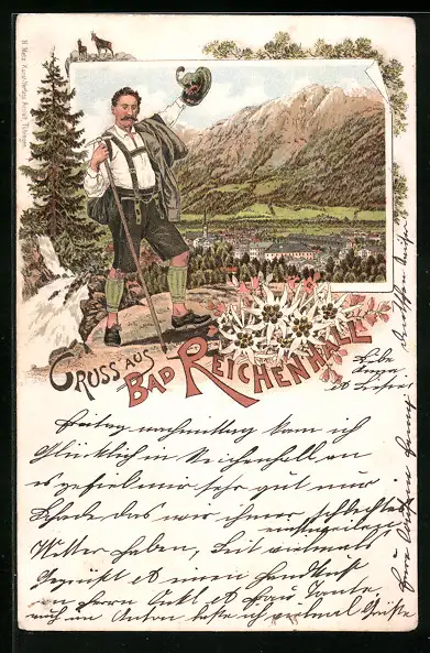 Lithographie Bad Reichenhall, Ortsansicht u. Mann in Tracht
