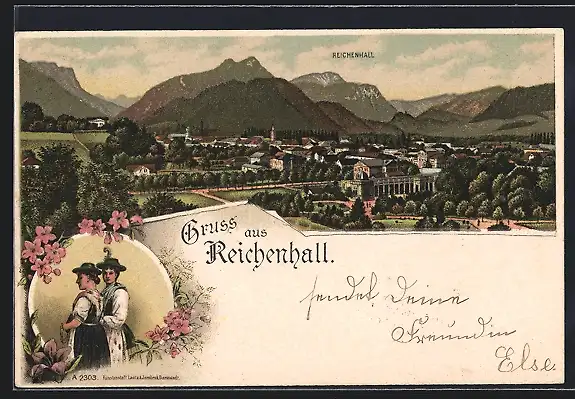 Lithographie Bad Reichenhall, Ortspanorama, Frauen in Trachten