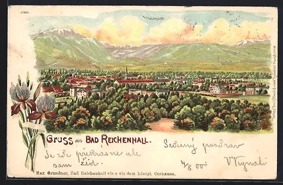 Lithographie Bad Reichenhall, Totalansicht mit Bergpanorama, Schwertlilien
