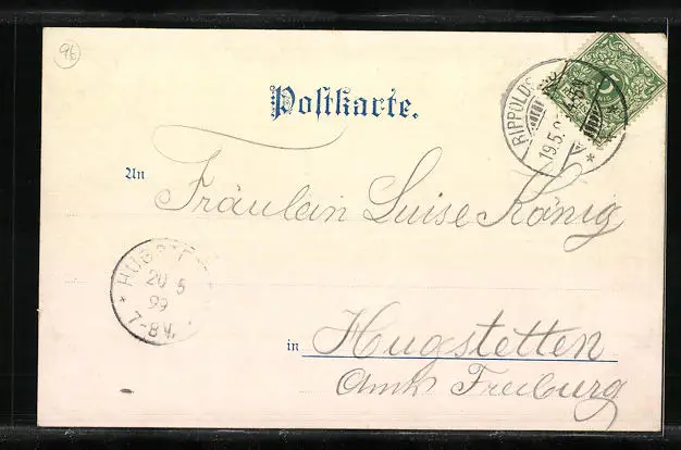 Personenbezogene Daten auf der Rückseite der Karte wurden durch blauen Textmarker unkenntlich gemacht. Die blauen Stellen sind auf die Vorderseite durchgeweicht und wirken sich negativ auf das Postkartenfoto aus