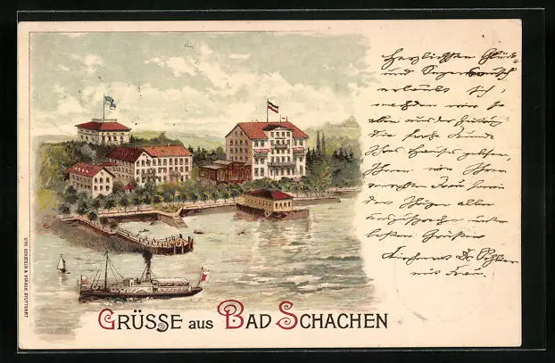 Lithographie Bad Schachen, Ortsansicht mit Hotels