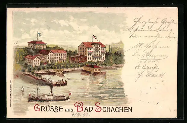 Lithographie Bad Schachen, Uferpartie mit Hotel