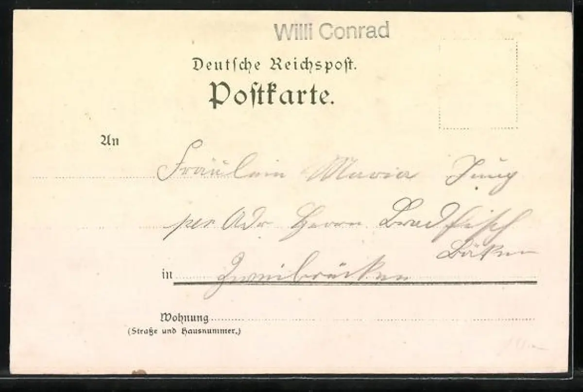 Personenbezogene Daten auf der Rückseite der Karte wurden durch blauen Textmarker unkenntlich gemacht. Die blauen Stellen sind auf die Vorderseite durchgeweicht und wirken sich negativ auf das Postkartenfoto aus