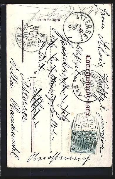 Personenbezogene Daten auf der Rückseite der Karte wurden durch blauen Textmarker unkenntlich gemacht. Die blauen Stellen sind auf die Vorderseite durchgeweicht und wirken sich negativ auf das Postkartenfoto aus