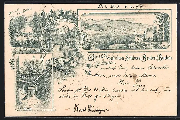 Lithographie Baden-Baden, Altes Schloss, Rittersaal, Eingang