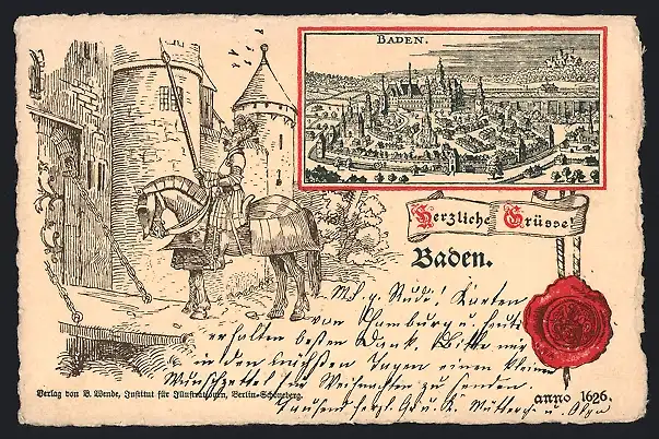 Lithographie Baden-Baden, Blick auf den Ort anno 1626 mit Ritter auf Pferd