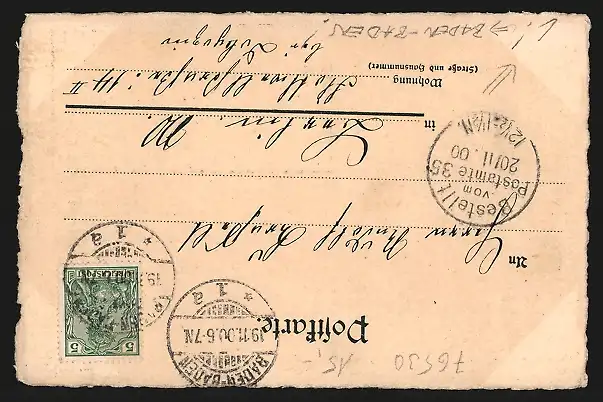 Personenbezogene Daten auf der Rückseite der Karte wurden durch blauen Textmarker unkenntlich gemacht. Die blauen Stellen sind auf die Vorderseite durchgeweicht und wirken sich negativ auf das Postkartenfoto aus
