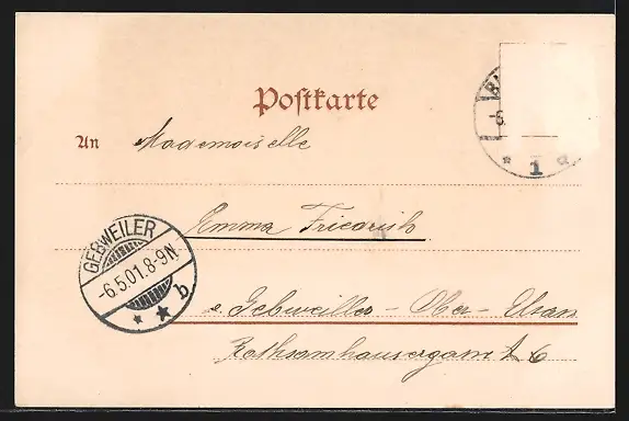 gelaufen 1901, Briefmarke entfernt, rückseitig Oberflächenschaden, guter Zustand
