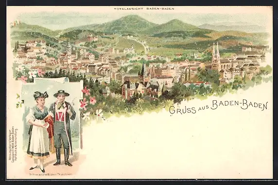 Lithographie Baden-Baden, Totalansicht mit Kirche, Schwarzwälder Trachten