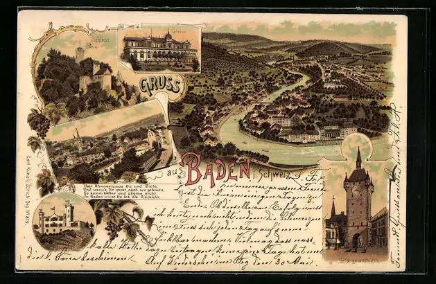 Lithographie Baden, Schloss Stein, Schartenfels, Totalansicht mit Flussschleife, Gefängnisturm