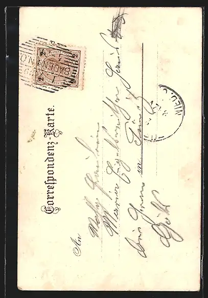 Personenbezogene Daten auf der Rückseite der Karte wurden durch blauen Textmarker unkenntlich gemacht. Die blauen Stellen sind auf die Vorderseite durchgeweicht und wirken sich negativ auf das Postkartenfoto aus