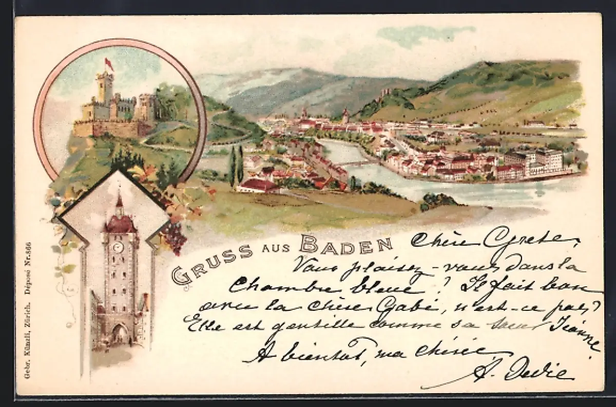 Lithographie Baden, Uhrenturm, Burg und Gesamtansicht