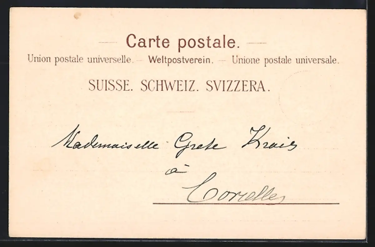 Personenbezogene Daten auf der Rückseite der Karte wurden durch blauen Textmarker unkenntlich gemacht. Die blauen Stellen sind auf die Vorderseite durchgeweicht und wirken sich negativ auf das Postkartenfoto aus