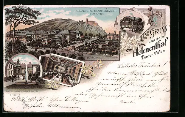 Lithographie Baden b. Wien, C. Sachers Etablissement Helenenthal, am Brunnen