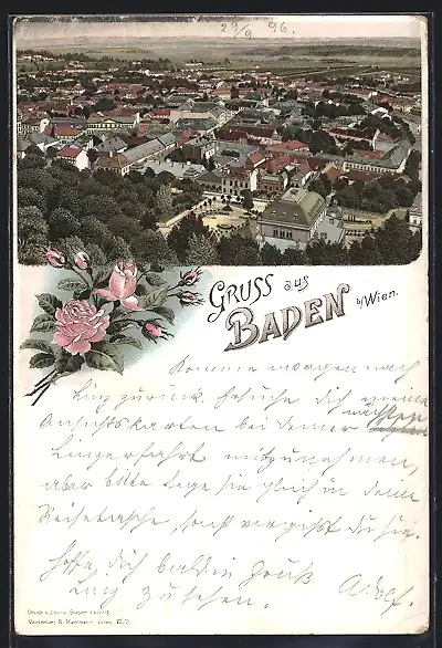 Lithographie Baden b. Wien, Teilansicht aus der Vogelschau