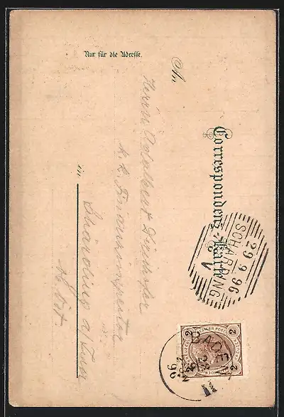 Personenbezogene Daten auf der Rückseite der Karte wurden durch blauen Textmarker unkenntlich gemacht. Die blauen Stellen sind auf die Vorderseite durchgeweicht und wirken sich negativ auf das Postkartenfoto aus