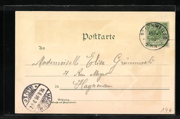 Personenbezogene Daten auf der Rückseite der Karte wurden durch blauen Textmarker unkenntlich gemacht. Die blauen Stellen sind auf die Vorderseite durchgeweicht und wirken sich negativ auf das Postkartenfoto aus