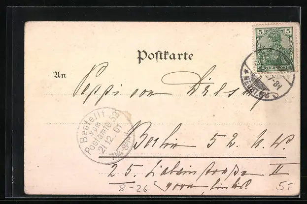 Personenbezogene Daten auf der Rückseite der Karte wurden durch blauen Textmarker unkenntlich gemacht. Die blauen Stellen sind auf die Vorderseite durchgeweicht und wirken sich negativ auf das Postkartenfoto aus