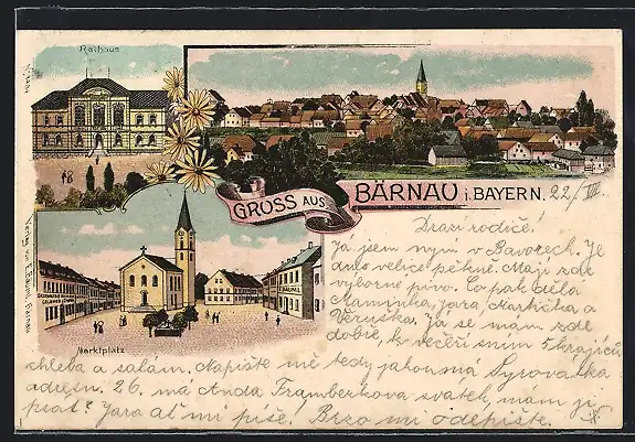 Lithographie Bärnau i. Bayern, Rathaus, Marktplatz mit Kirche