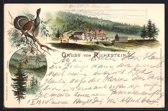 Lithographie Baiersbronn, Ruhestein, Ortsansicht, Auerhahn auf einem Ast, Partie an einem Waldsee
