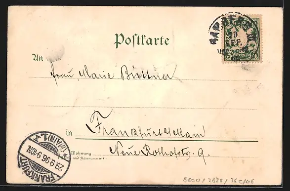 Personenbezogene Daten auf der Rückseite der Karte wurden durch blauen Textmarker unkenntlich gemacht. Die blauen Stellen sind auf die Vorderseite durchgeweicht und wirken sich negativ auf das Postkartenfoto aus