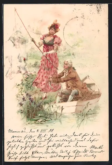 Lithographie Barock-Paar beim Angeln in Ruderboot