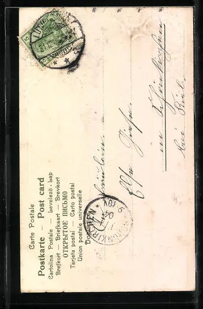 Personenbezogene Daten auf der Rückseite der Karte wurden durch blauen Textmarker unkenntlich gemacht. Die blauen Stellen sind auf die Vorderseite durchgeweicht und wirken sich negativ auf das Postkartenfoto aus