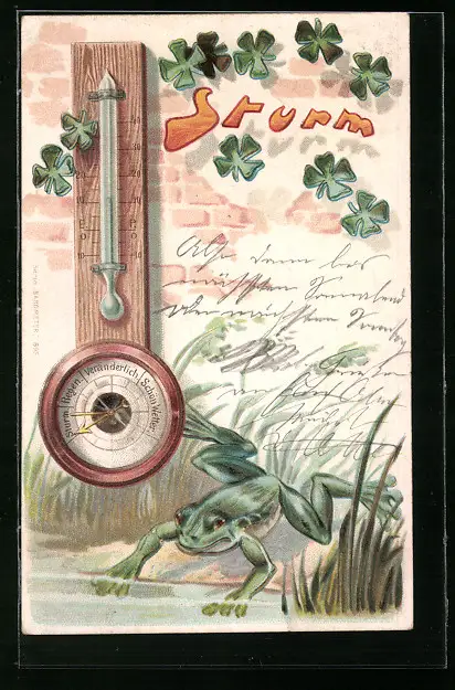 Lithographie Barometer steht auf Sturm, Frosch springt ins Wasser