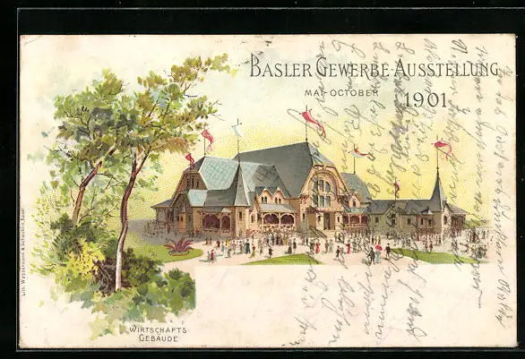 Lithographie Basel, Gewerbe-Ausstellung 1901, Wirtschaftsgebäude mit Besuchern