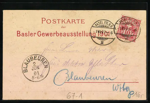 Personenbezogene Daten auf der Rückseite der Karte wurden durch blauen Textmarker unkenntlich gemacht. Die blauen Stellen sind auf die Vorderseite durchgeweicht und wirken sich negativ auf das Postkartenfoto aus